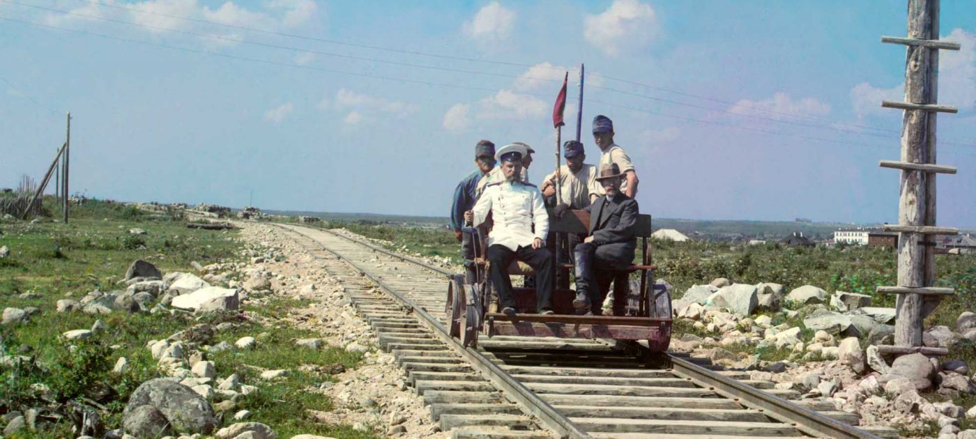 The historic colour image reproduced here, shows pioneer photographer S.M. Prokudin-Gorskii and others riding a handcar along the newly-built Murmansk Railway, beside the shores of Lake Onega, circa 1915.